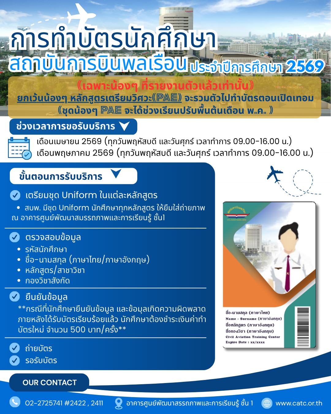 การทำบัตรนักศึกษาสถาบันการบินพลเรือน(ยกเว้น หลักสูตรเตรียมวิศวะ PAE) ประจำปีการศึกษา 2569